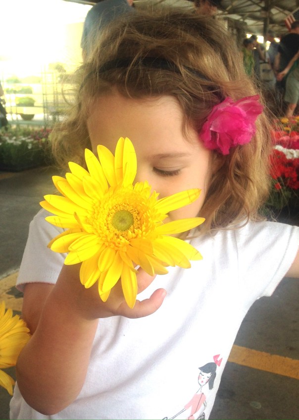 Our three kids (Addy, Clarence, and Eloise) and I went to the farmer’s market early Saturday morning. Halfway through, a kind flower vendor handed each child a free daisy – lovely, rich yellow with strong green stems. The children received the gifts with wonder (apparently, I don’t do enough cut flowers in my house) and carried their treasures around the market carefully.